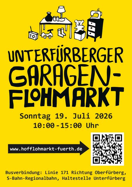 Am Sonntag, den 19.07.2026, findet von 10 bis 15 Uhr der 8. Unterfürberger Garagentrödel statt.
